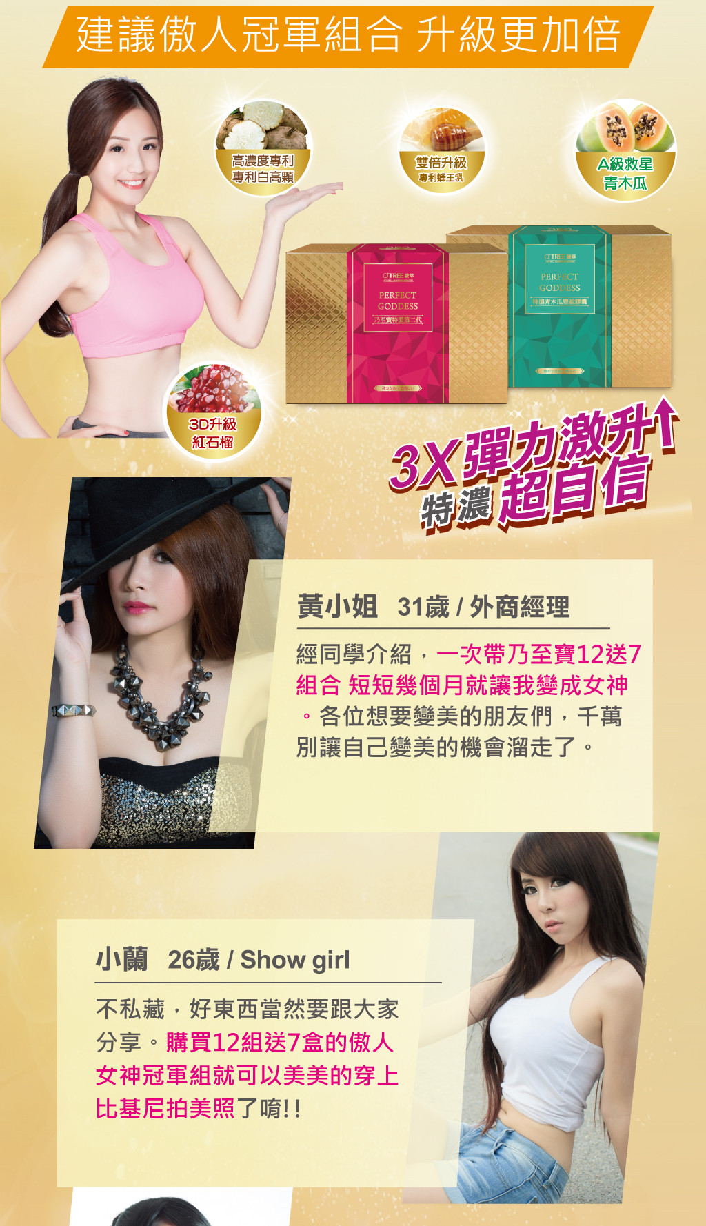 ‧使用期間建議搭配【特濃青木瓜豐盈膠囊】、【鑽透膠原蛋白美顏粉】或【活力美胸精華按摩使用】,使目標更快速達成。