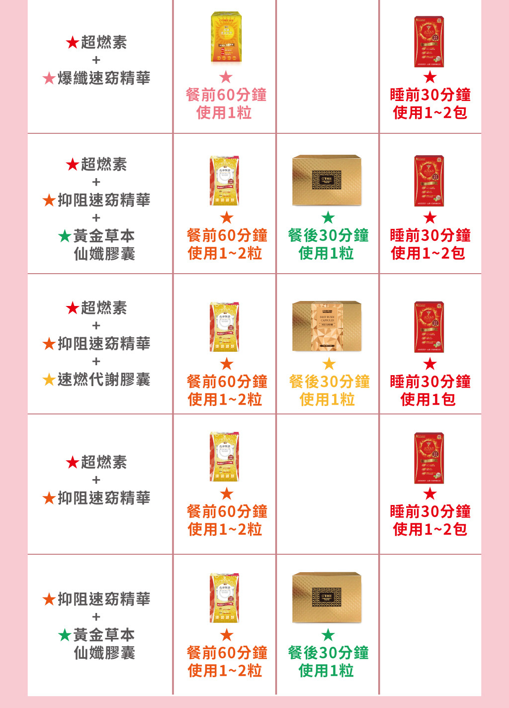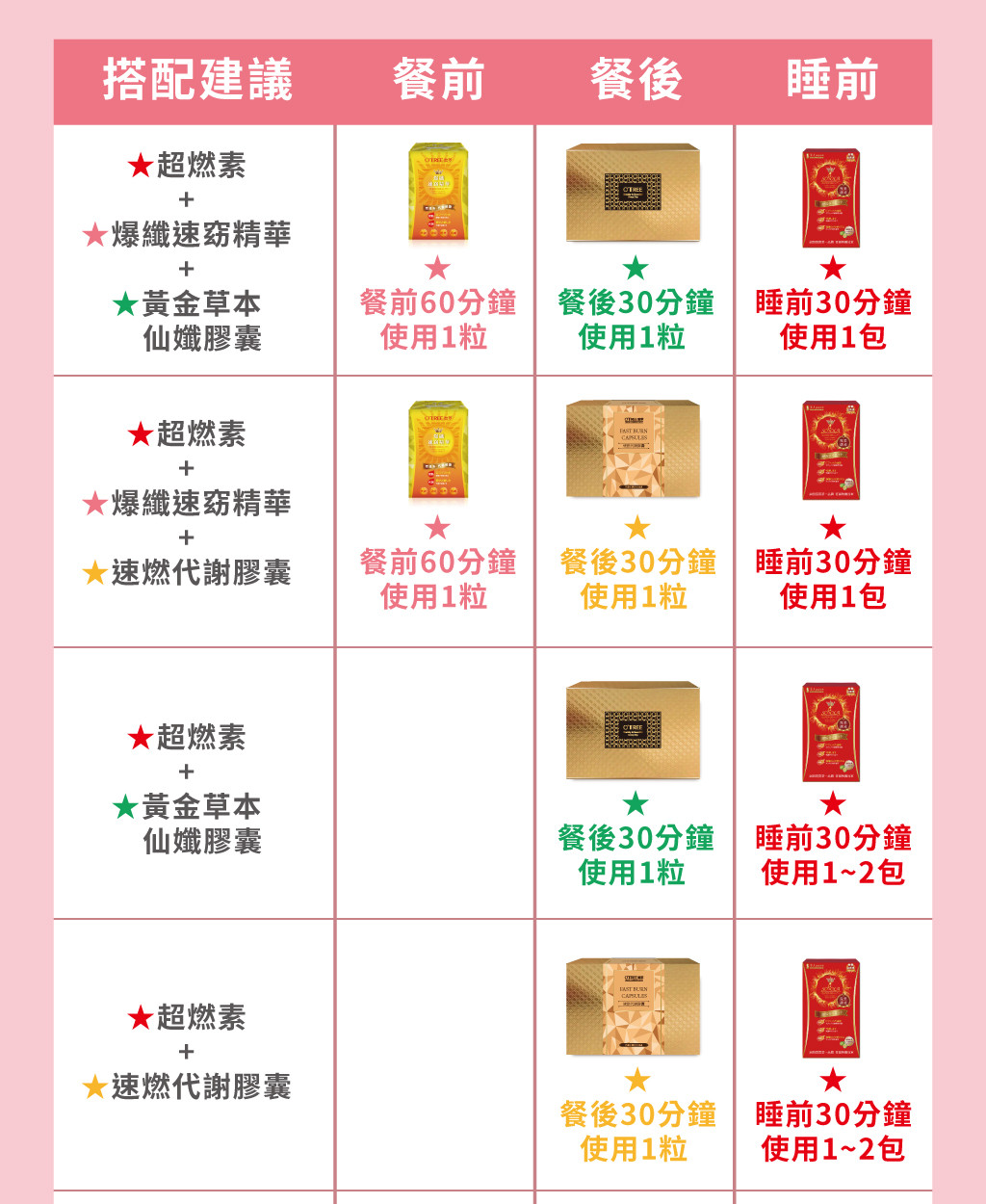 使用時間 | 餐前 | 餐後 | 下午3~4點 or 睡前30分(擇一即可) |