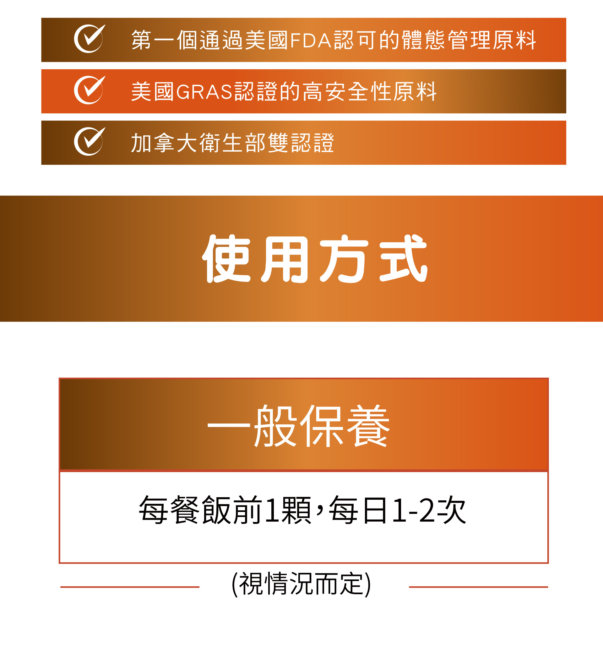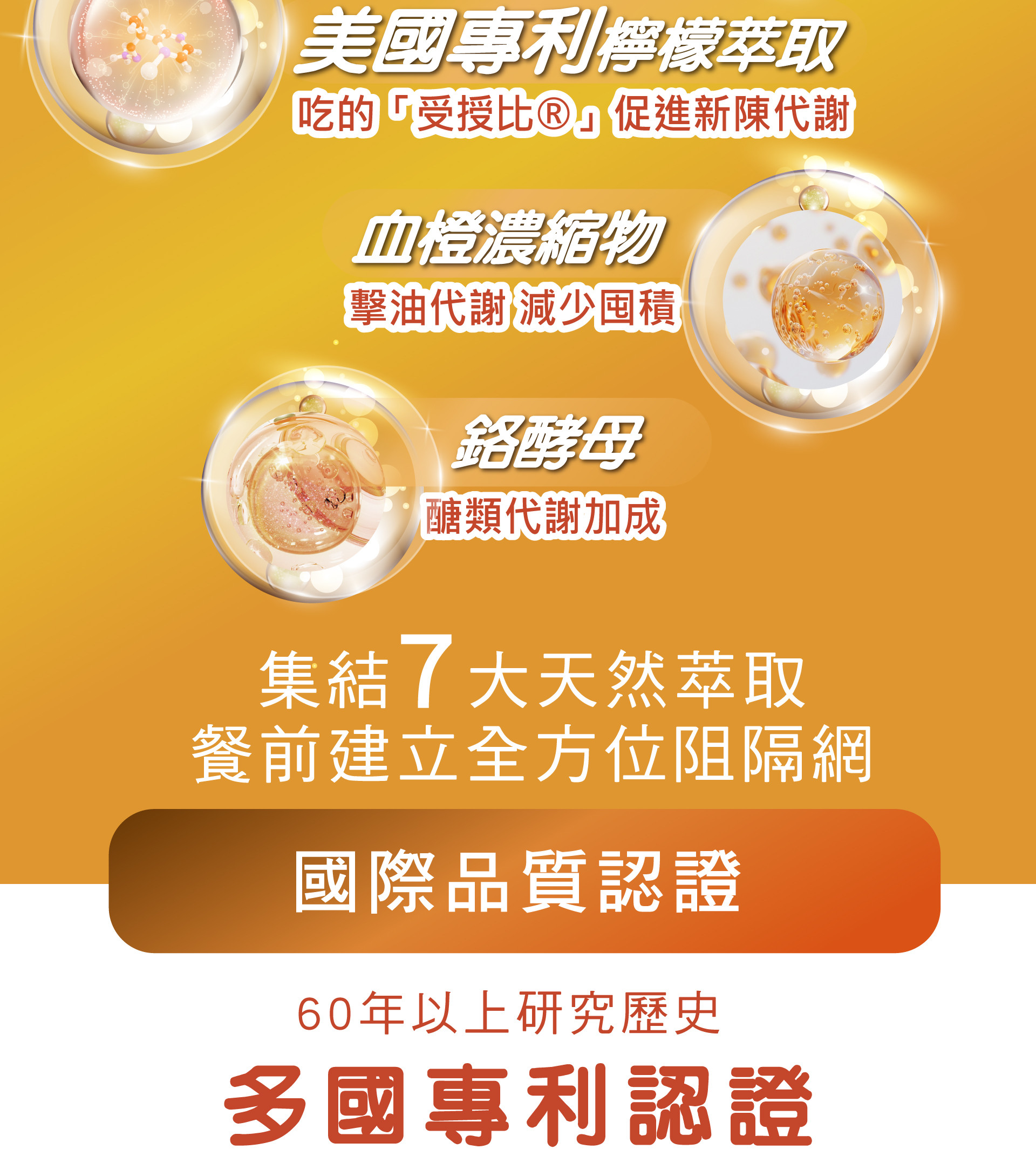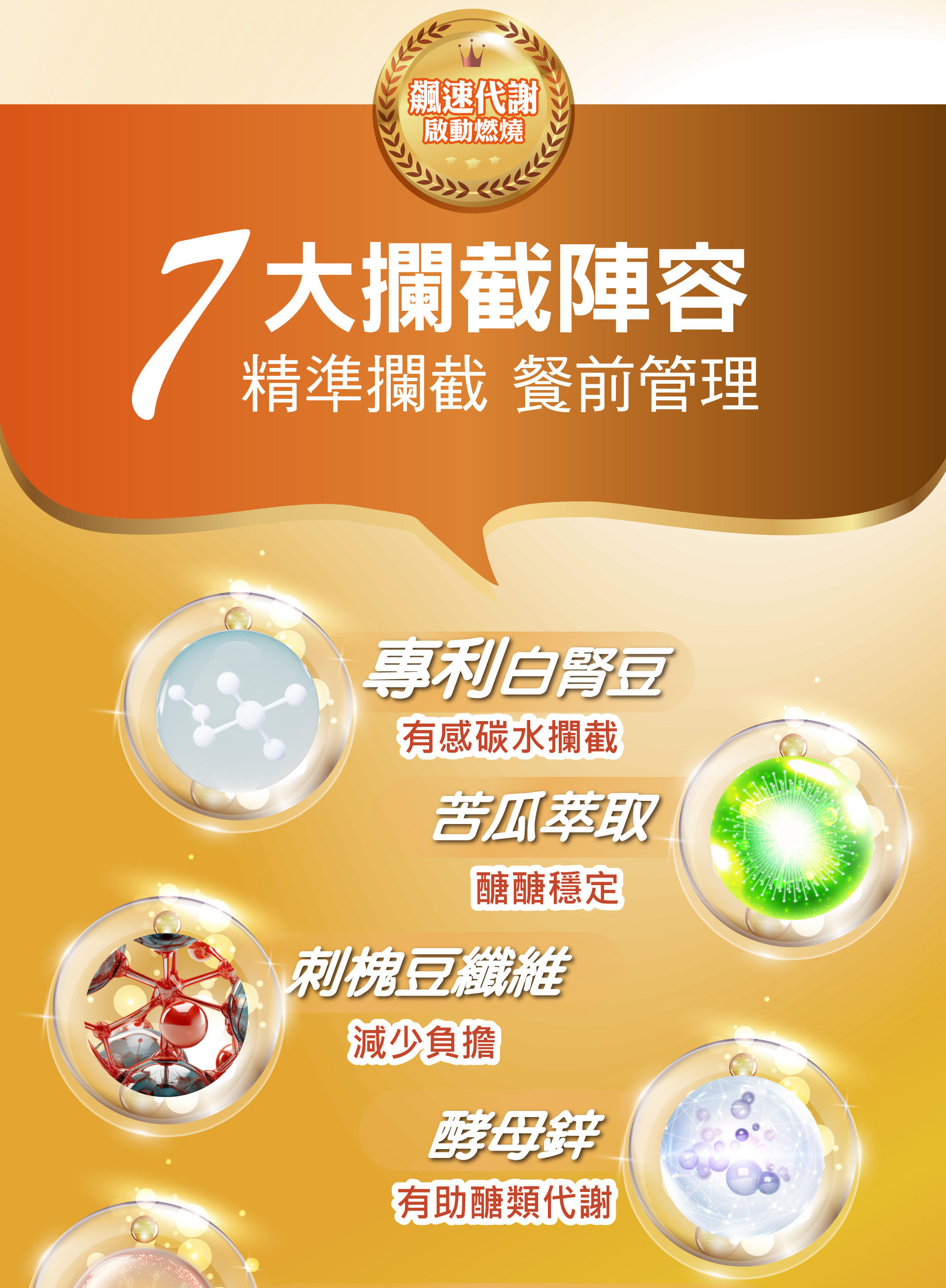 成 分:白腎豆抽出物(白腎豆抽出物、阿拉伯膠)、玉米來源可溶性纖維、島胡椒萃取粉(糊精、島胡椒萃取)、鋅酵母、鉻酵母、刺槐豆萃取物(刺槐豆萃取物、果寡糖、刺槐豆膠、二氧化矽)、檸檬萃取物、苦瓜萃取粉(山苦瓜、麥芽糊精)、血橙濃縮物(血橙濃縮物、麥芽糊精)。